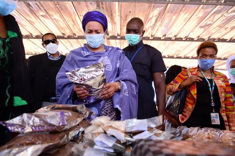 At the end of these heart-to-heart discussions between "African sisters, these determined and committed women leaders," the delegation visited the exhibition, admiring the handicrafts and products processed by women in these projects. Of the half-dozen stands installed, the first one allowed Mrs. MOHAMMED to participate in soap making session alongside women working in this sector. While visiting the hangars that will serve as workshops for women, the Deputy Secretary-General of the United Nations briefly talked with a small group of women waiting for her there.