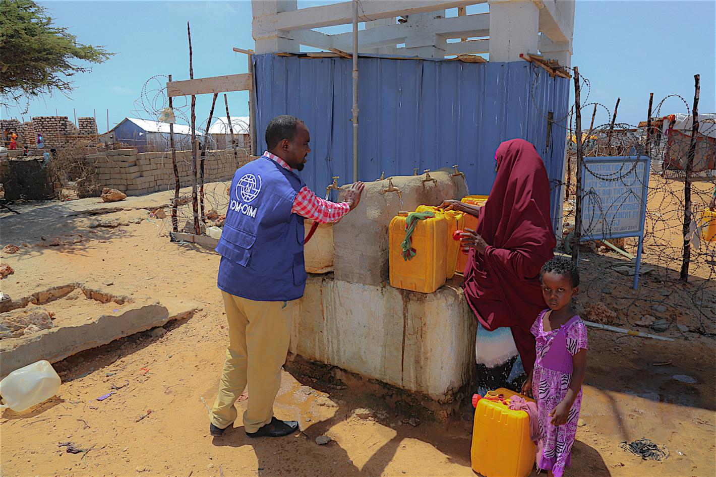 On a hot, flat, stony plateau outside Kismaayo, hundreds of people pack into a settlement for internally displaced persons (IDPs). Bashir Muhamed Muktar stands at a water point, helping weary ladies lift jerry cans of water…