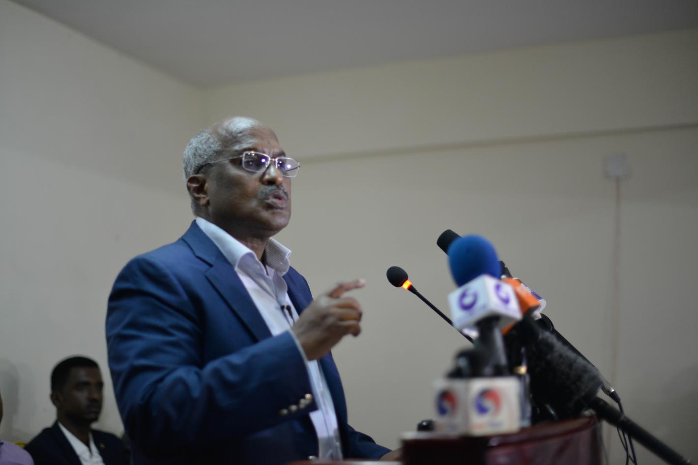Federal Indirect Electoral Implementation Team chairperson Omar Mohamed Abdulle ‘Dhagey’ addressing the media at press conference held in Mogadishu on 26 September 2016