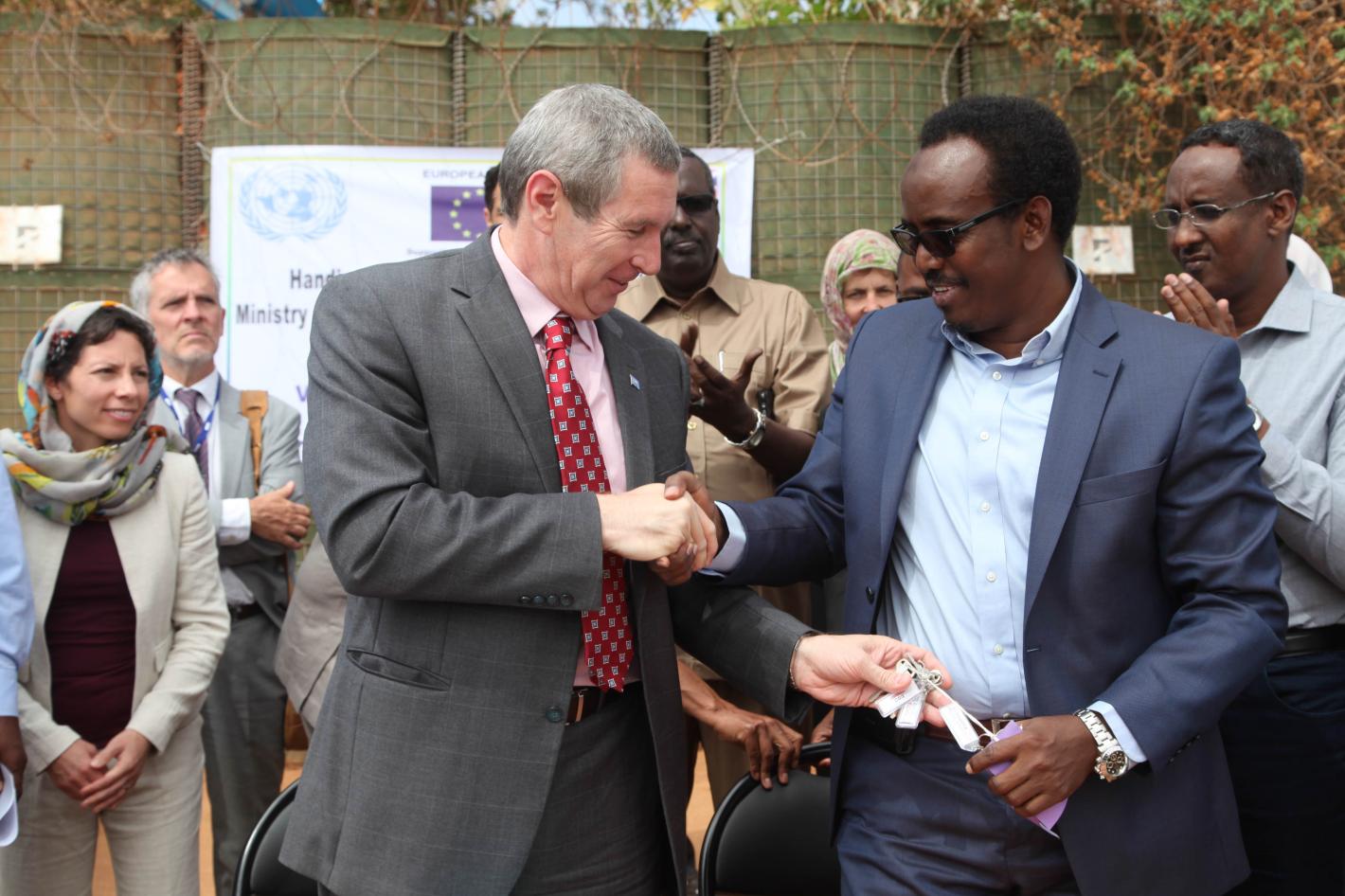 The Deputy Special Representative of the United Nations Secretary-General (DSRSG) for Somalia, Peter de Clercq (left), hands over keys for donated vehicles to the Jubbaland Minister of Justice, Constitutional and Religious Affairs, Adan Ibrahim Awhersi on 19 September2016. The DSRSG was in Kismayo to discuss with the Jubbaland leadership the plight of returnee Somali refugees from Dadaab. UN Photo