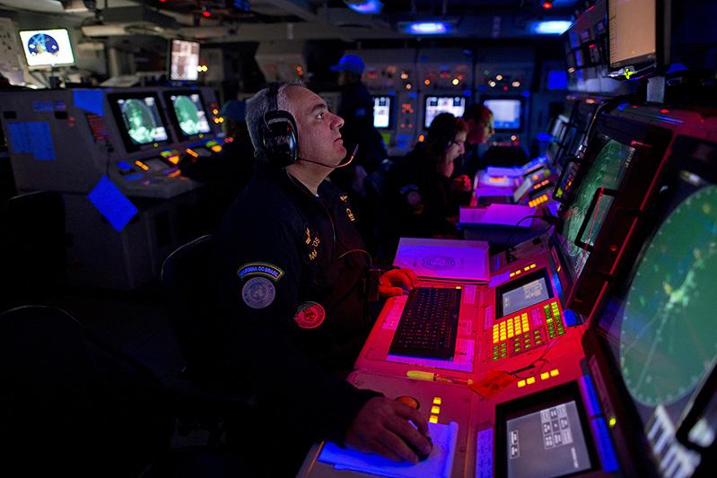 A UNIFIL Brazilian Peacekeeper from the Maritime Task Force (MTF) in the operations room of the UNIFIL flagship Independencia, off the coast of Beirut, Lebanon.
