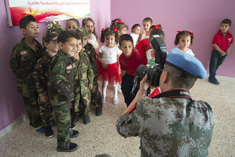A UNIFIL Chinese peacekeepers takes a photos of children from Al Majadil Public school in front of a newly painted wall.