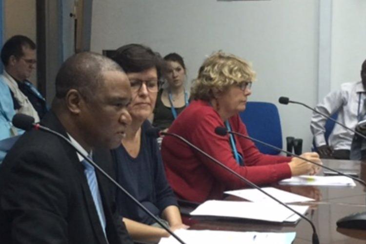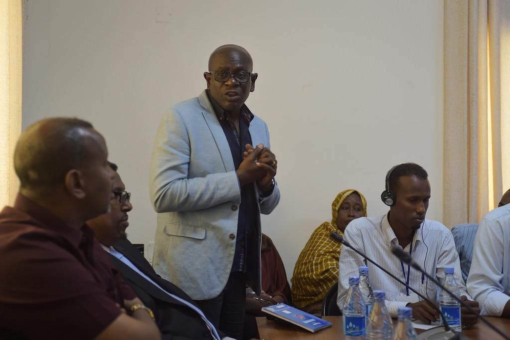The director of the United nations Support Office in Somalia (UNSOS), Amadu Kamara, speaks to members of the Somali business community at the UN's offices in Mogadishu, Somalia, on May 21, 2016.The meeting was organized and designed to make it easier for Somali businessmen to act as vendors for the United Nations in Somalia. UN Photo