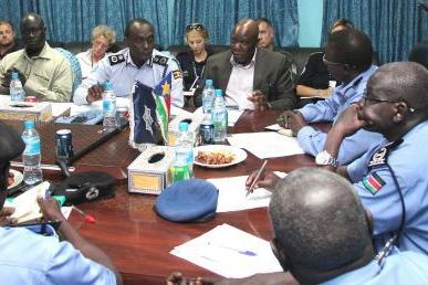 Deputy Special Representative of the Secretary General Raisedon Zenenga, UN Police Commissioner Fred Yiga and UNMISS Human Rights Director Ibrahim Wani meeting South Sudan National Police Service leadership in Juba to explain…