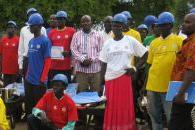 10 June 2013 - Concluding a brick-molding project today in Pariak, Jonglei State, UNMISS and the state government handed out buckets, carpets, wheelbarrows, shovels, brick molds, helmets, gumboots and gloves to 38…
