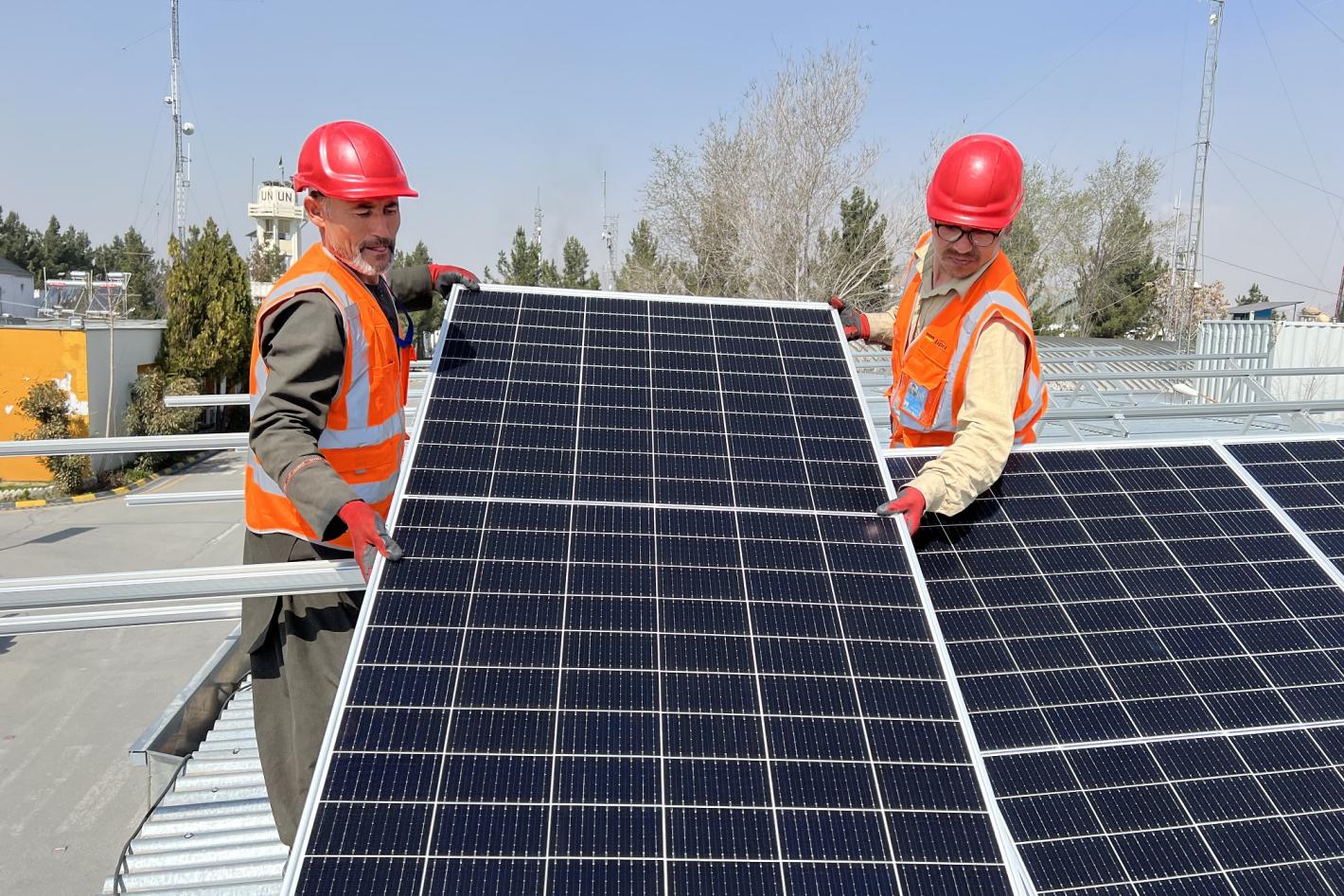 UNAMA workers install new solar panels in the mission headquarters in Kabul.