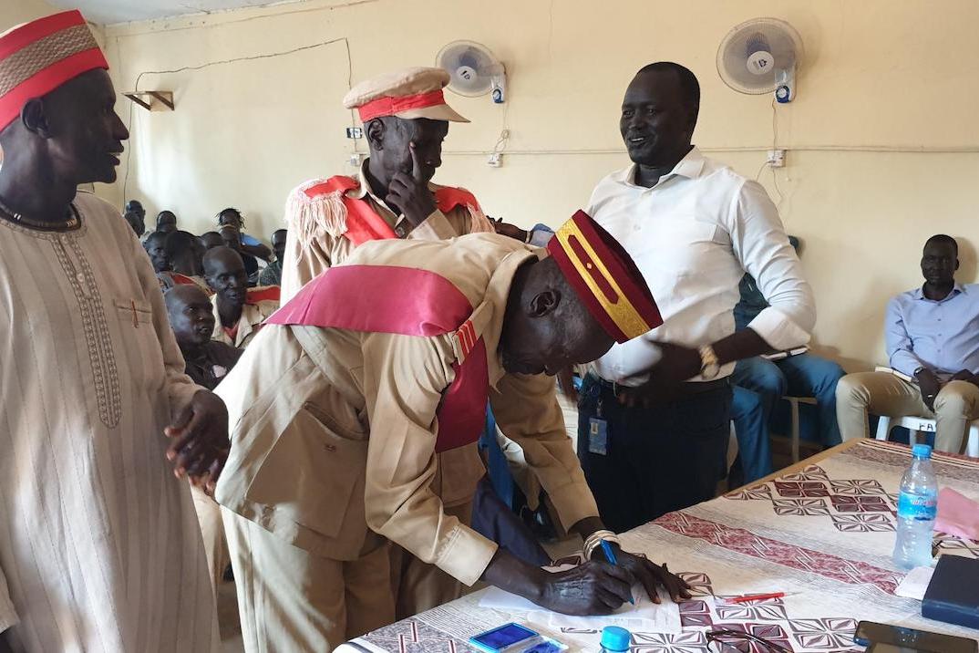 Participants from three counties in Lakes State sign a document with agreed-on resolutions to reduce intercommunal tensions. Photo: James Mawien Manyuol/UNMISS